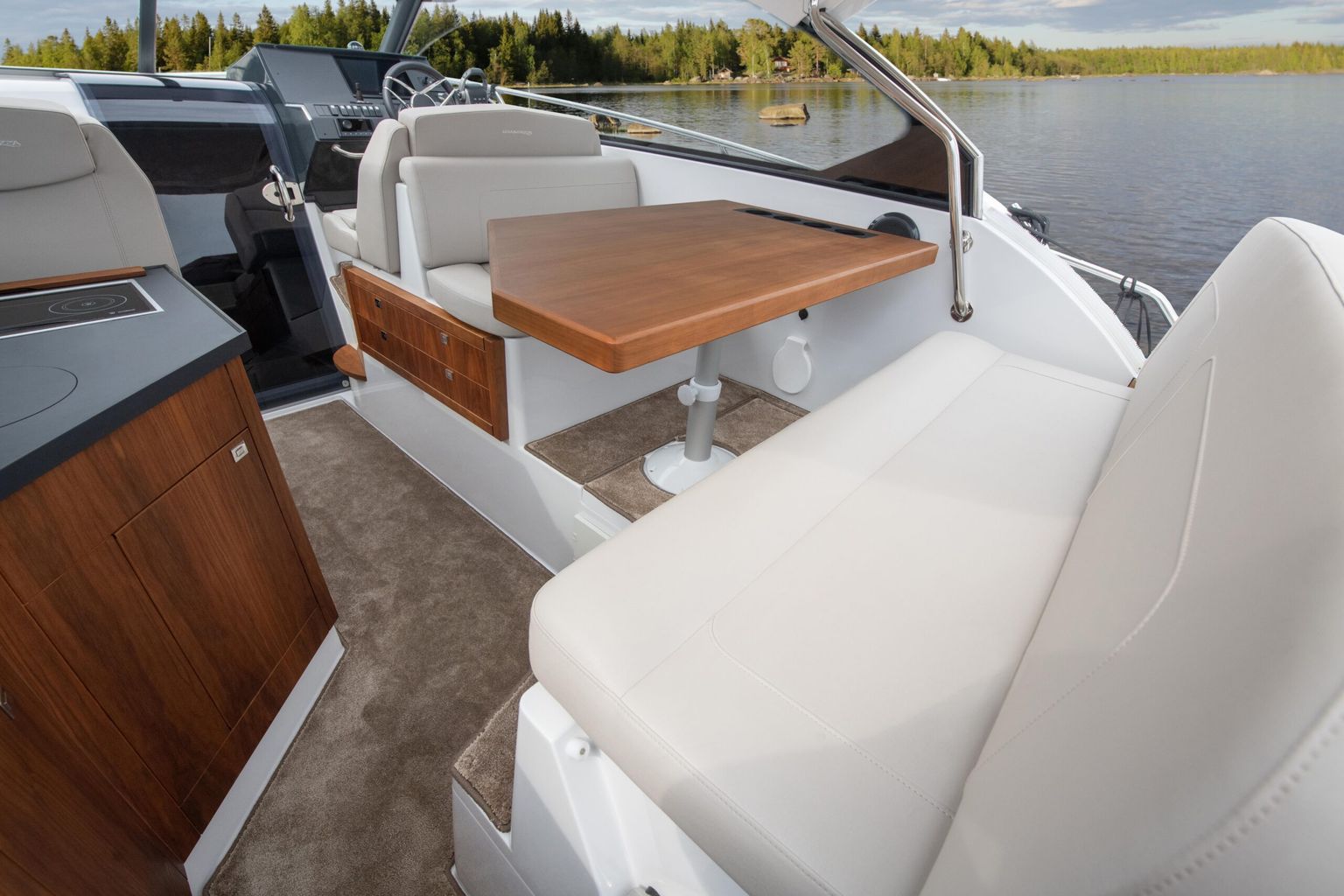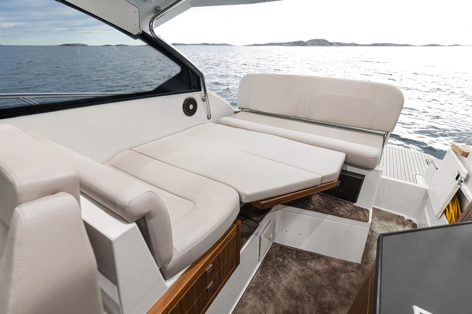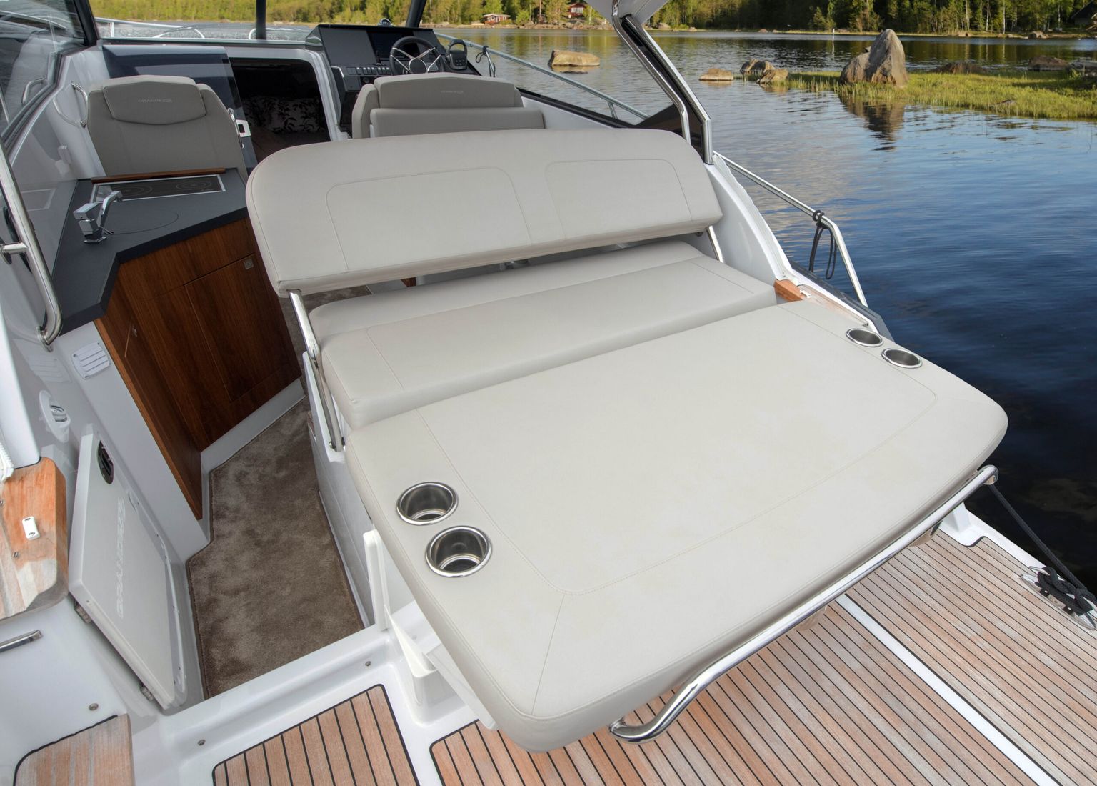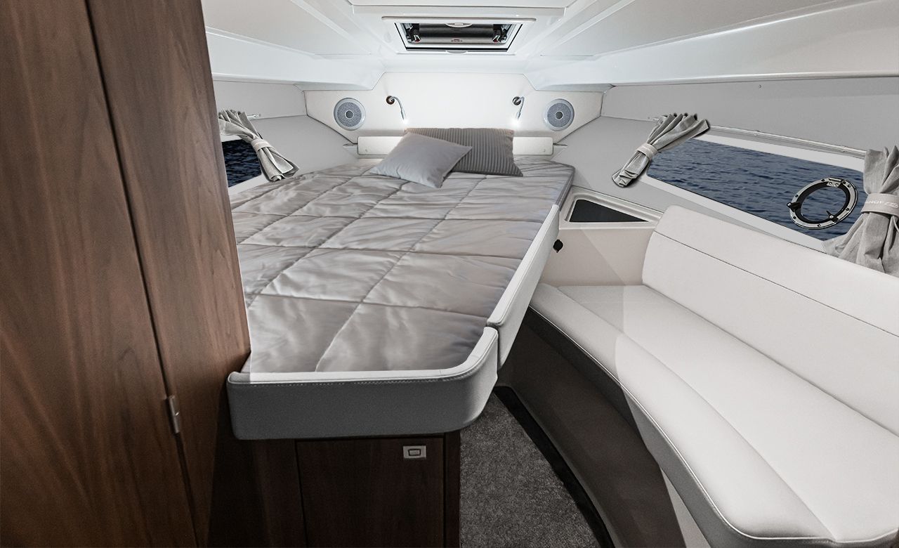 • Просторный кокпит-лаунж: L-образный диван, стол-dinette и широкая лежанка трансформируются в солнцезащитную зону одним движением.