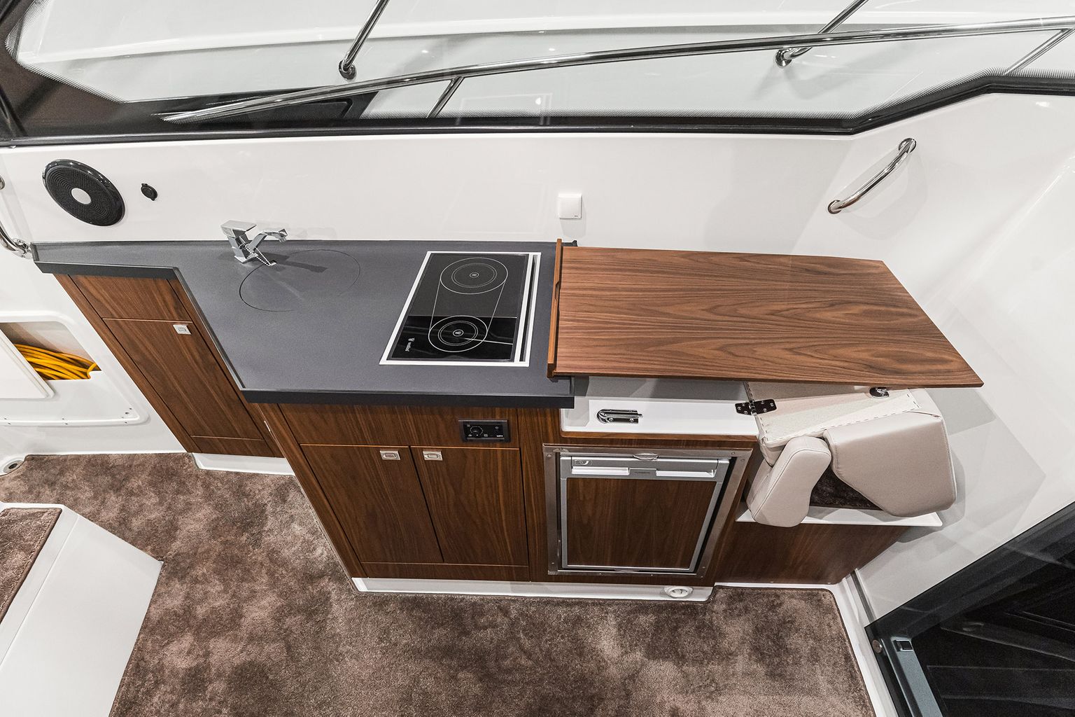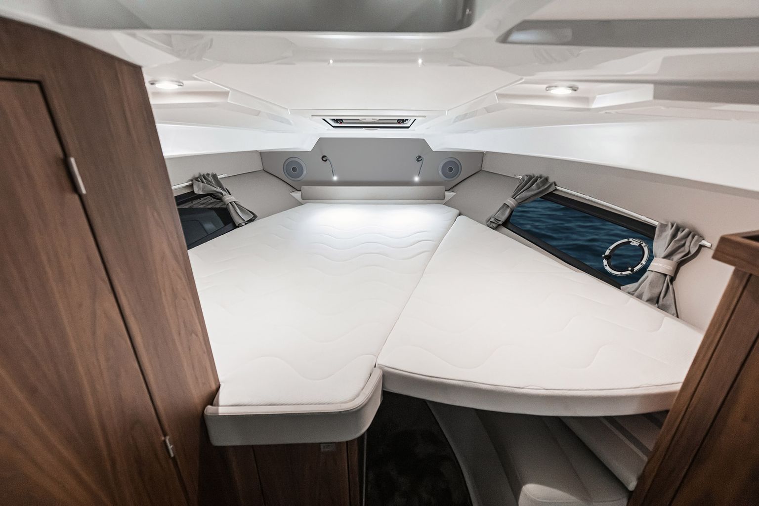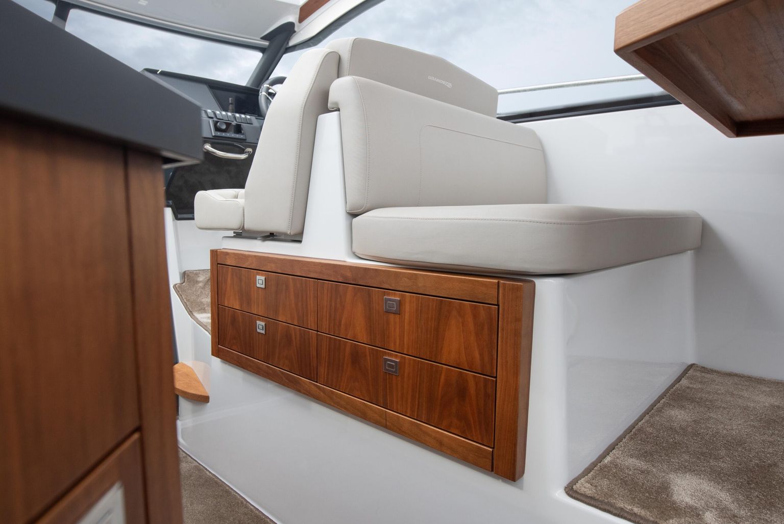 • Просторный кокпит-лаунж: L-образный диван, стол-dinette и широкая лежанка трансформируются в солнцезащитную зону одним движением.